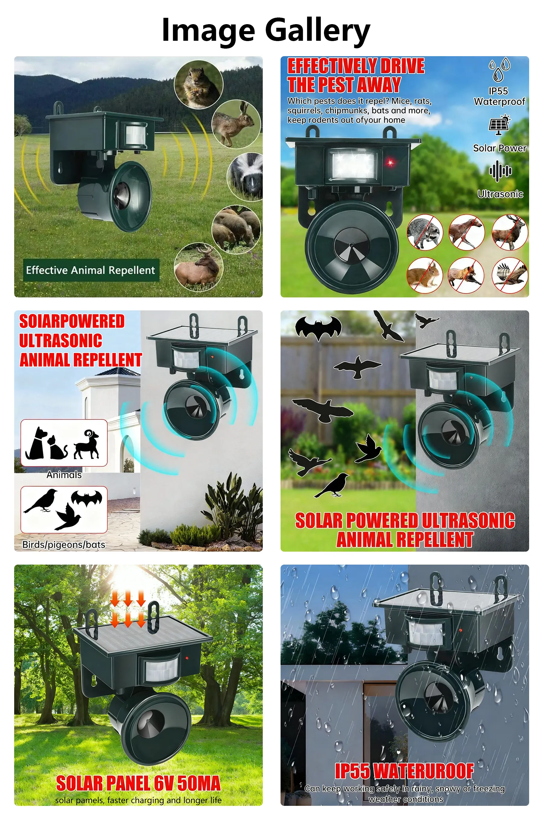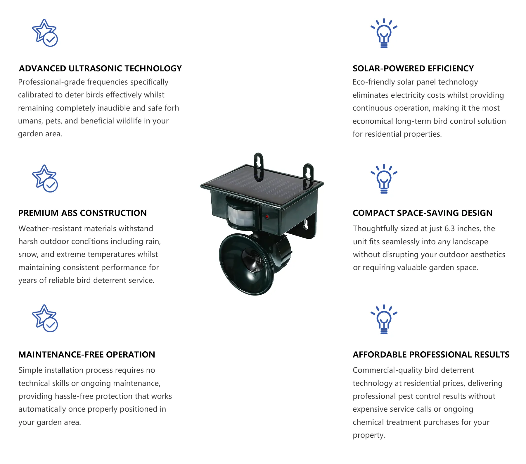 • Ultrasonic & Motion-Sensing Technology — 180° motion sensing, effectively repels birds, safe and eco-friendly.