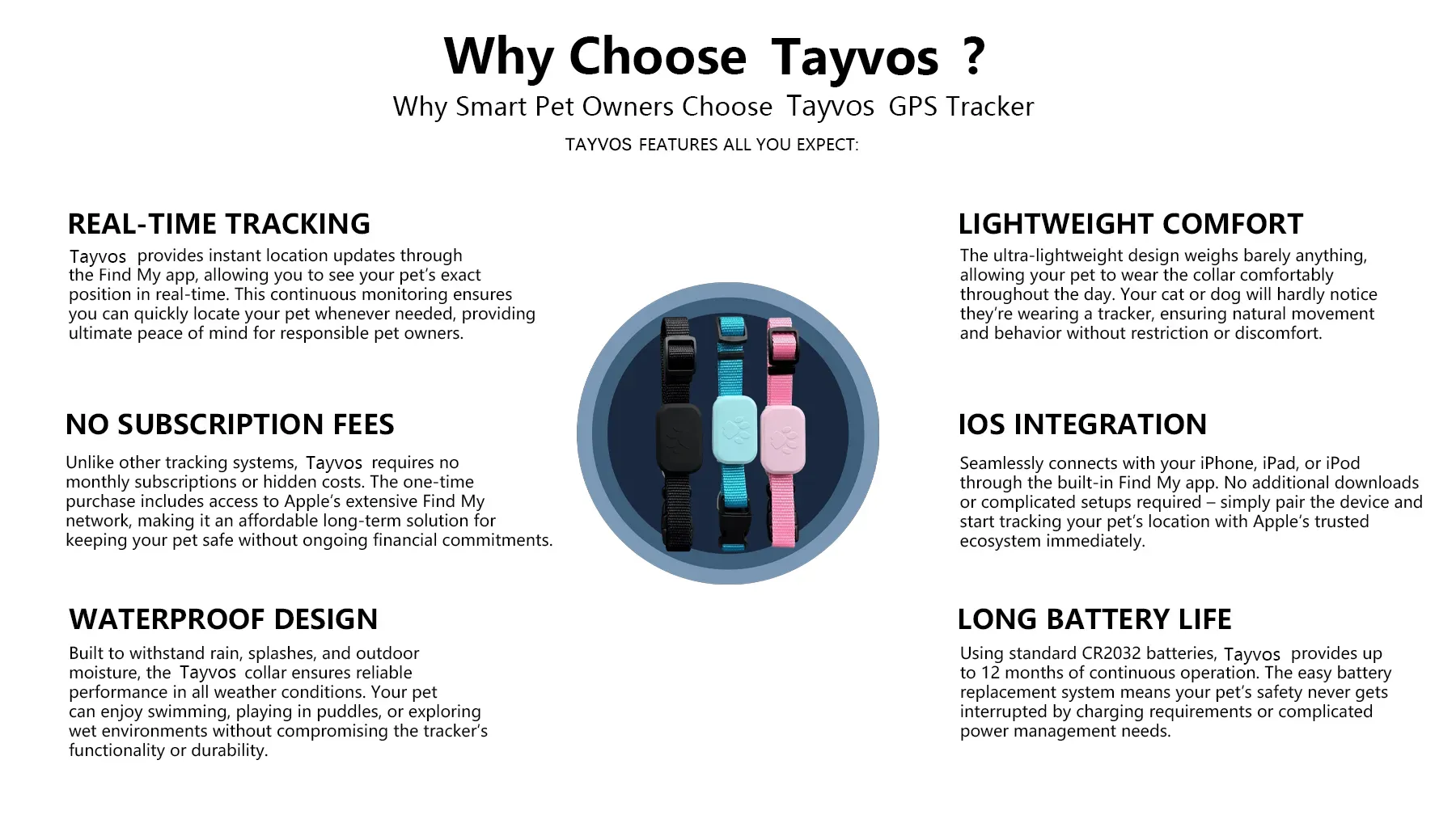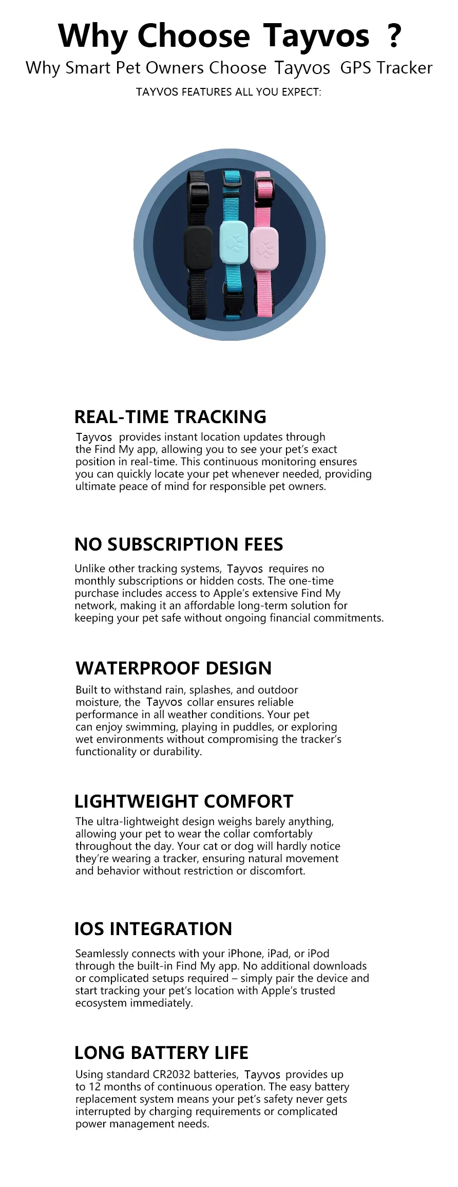 The Tayvos tracker features an adjustable, lightweight collar that ensures all-day comfort for your pet. Its simple battery replacement system and easy iOS integration make pet tracking effortless and worry-free for busy pet owners.